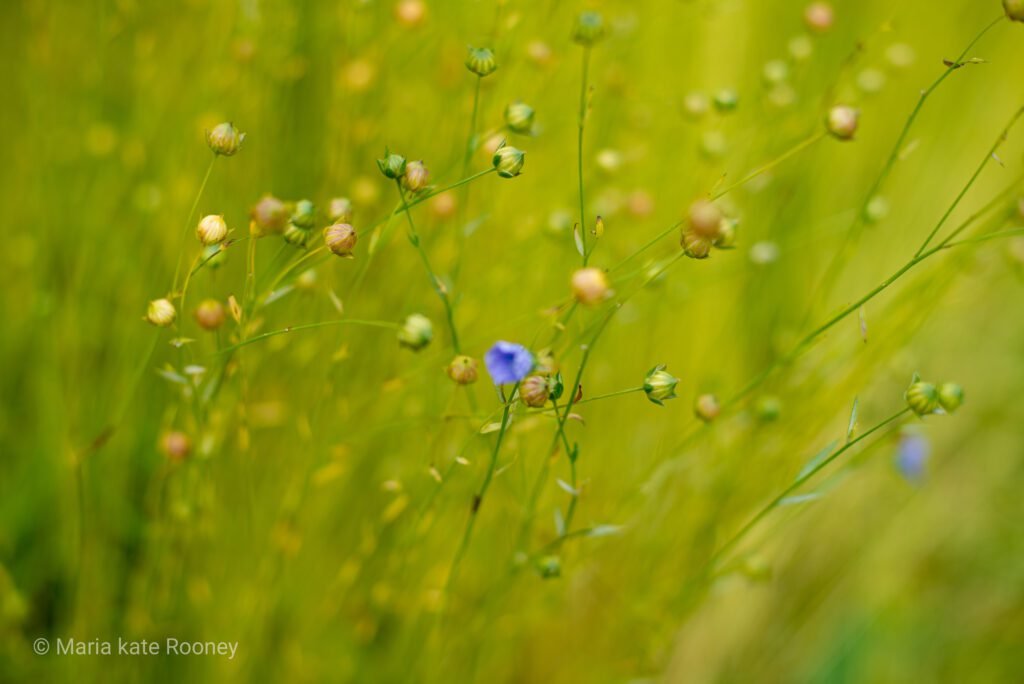 Flax for linen traditionally takes 100 days to grow. We plant in early May. By mid July the first flowers appear and the field is absolutely buzzing with insects and flocks of linnets.