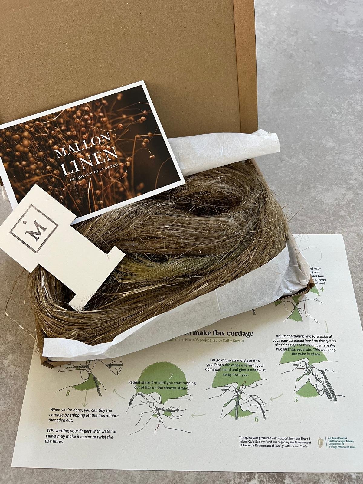 To make it easy to join the project we are offering a little kit, it contains 100g of scutched flax fibre, grown on our farm in County Tyrone, retted and scutched on site. It has a guide on how to make cordage beautifully drawn up by Malú at Fibreshed Ireland.