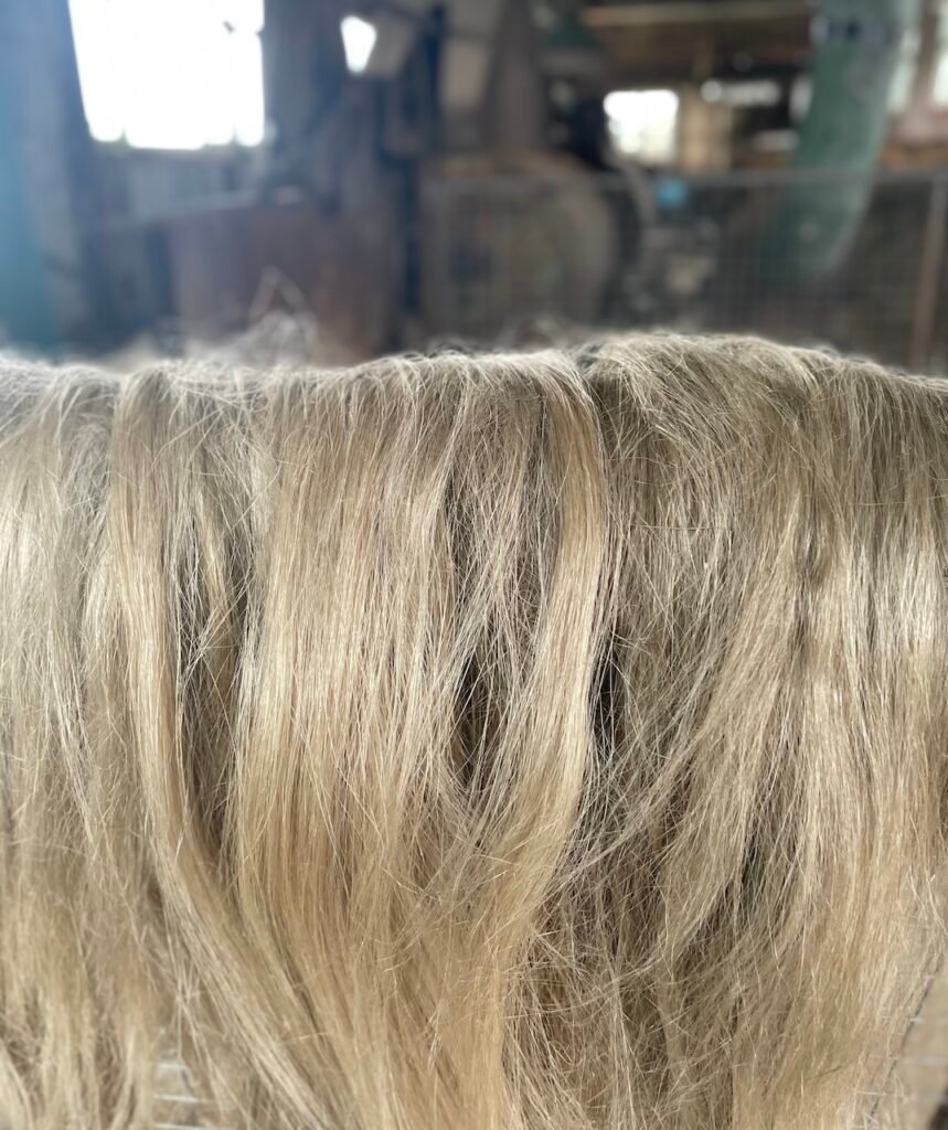 Scutching is the process of taking off all the outer parts of the flax plant to leave the long fibres. We do this once the harvested flax has been retted, dried and broken using our old, refurbished flax scutcher. You can read more about the full process here.